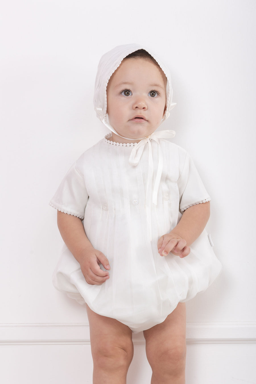 Elegante y bello ropón desmontable de niño tono ivory . Confeccionado en organza, alforzado y con varonil encaje en el talle. Después de lucir su hermoso faldón, conviértelo en una cómoda y bella ranita para que luzca guapo y elegante...