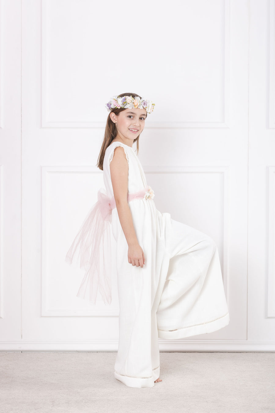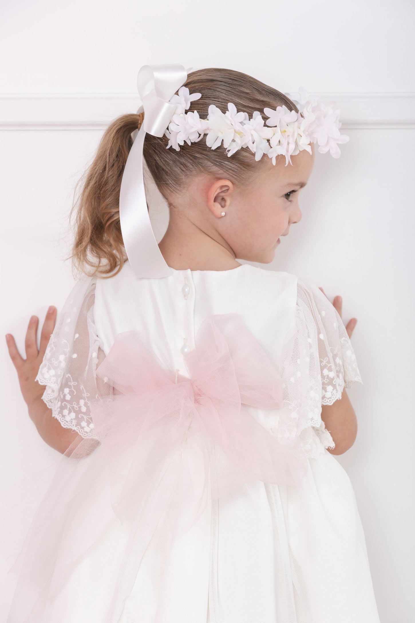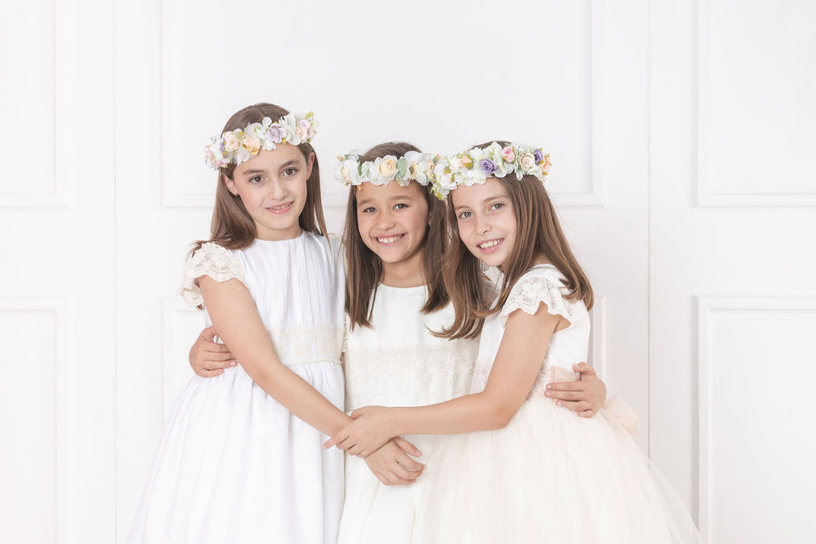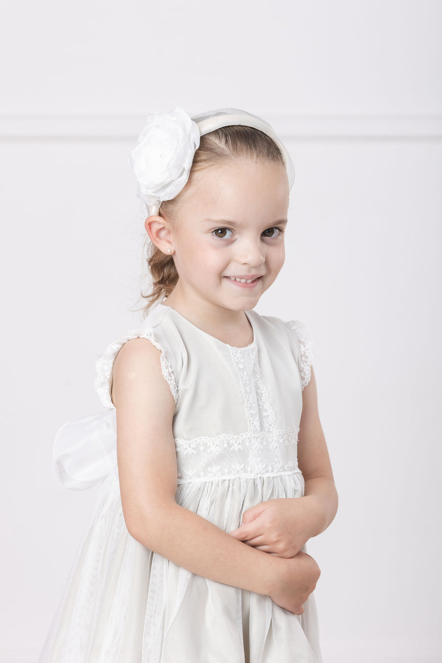 Tierno y elegante vestido de ceremonia en malla. Con retoño en falda y bello encaje ancho como manga estilo mariposa. Fresco en tono ivory idea para tus pajes, su presentación, bautizo o cualquier ceremonia. Banda de tul para un bello...